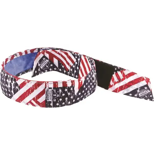 Ergodyne 6705CT Stars and Stripes Cooling Bandana Headband PVA HL Advanced Pva Material Activates Easily And Quickly When Run Under Water For One Minute Re-usable, just re-wet Super-evaporative cooling process helps keep you cool Breakaway hook and loop closure Colors: Solid Blue, Hi-Vis Lime, Red Western, Blue Western, Stars & Stripes, Flames, Camouflage, Skulls Mfg #12571