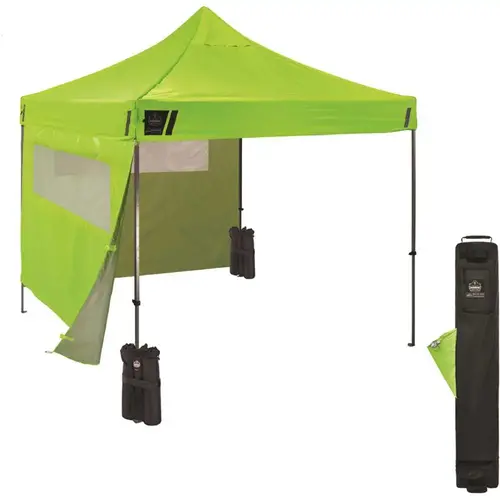 Ergodyne 6052 Single Lime Heavy-Duty Tent Kit Mesh Windows - 10ft x 10ft 10 X 10 Footprint 10ft X 10ft // 3m X 3m Canopy Provides 100 Square Feet Of Shaded Area ULTIMATE DURABILITY Steel frame and reinforced corners on the canopy to withstand tough conditions UV PROTECTION Rugged 300D polyester canopy with PU coating and UV treatments MULTIPLE HEIGHTS ABS plastic sliders on legs adjust to 3 height settings ranging from 10ft - 14ft / 3m - 4m VENTED CANOPY Double-vented canopy for maximum airflow INCREASED VISIBILITY Hi-vis option and reflective accents TESTED & APPROVED Meets CPAI-84 flame resistance code KIT INCLUDES: One SHAX 6000 Heavy-Duty Pop-Up Tent KIT INCLUDES: Two SHAX 6092 Pop-Up Tent Sidewalls with Mesh Windows for blocking sun, wind and rain KIT INCLUDES: Two SHAX 6094 Tent Weight Bags (40lbs) for extra security on windy days KIT INCLUDES: One large storage bag with wheels that fits collapsed tent with canopy still on KIT INCLUDES: Four heavy-duty ground stakes and four ropes for added stability Mfg #12983