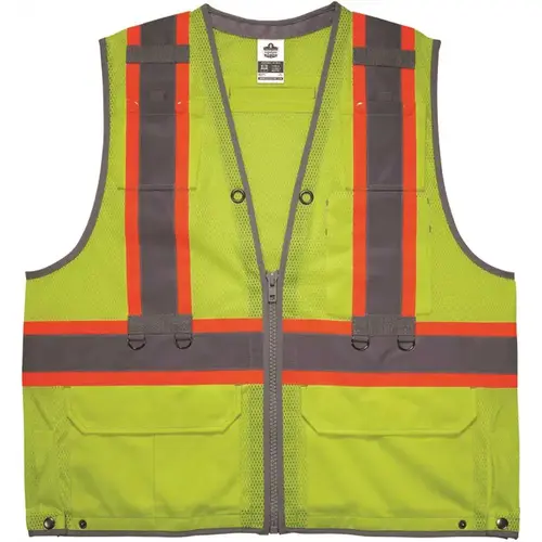Ergodyne 8231TV 4XL/5XL Lime Class 2 Hi-Vis Tool Tethering Safety Vest Dual Certified Ansi/isea 121 And Ansi/isea 107-2020 Certified For Dropped Object Prevention And Hi-Visibility Compliance 20+ TETHERING POINTS All ANSI/ISEA 121-2018 certified to 2 lbs and 4-foot max tether WEAR OVER FALL HARNESSES Back/side d-ring enables wear over fall protection systems for maximum visibility, easy access to tethers and increased material longevity LOW-LIGHT VISIBILITY ANSI/ISEA 107-2020 Type R Class 2 compliant 2 TOOL POCKETS Strategic and easily-accessible tool storage while tethered LANYARD INTEGRATION 2 chest pockets designed for the Squids 3000, 3001, 3010, or 3011 retractable tool lanyards ALSO SOLD AS A KIT 8231TVK Tether Vest Kit that includes 2 coil lanyards and 1 retractable lanyard Mfg #24179