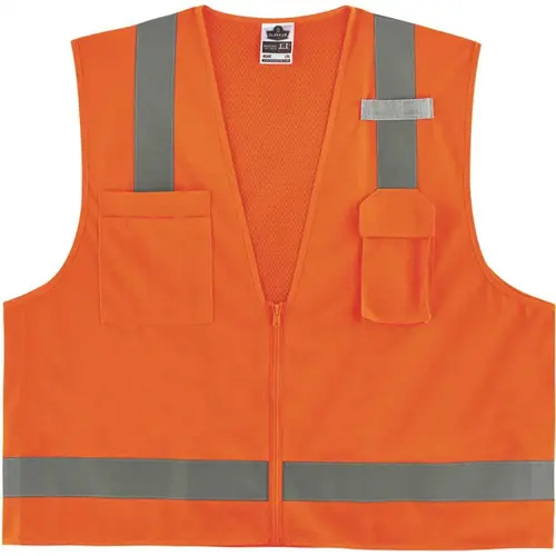 Ergodyne 8249Z-S S Orange Class 2 Economy Surveyors Vest - Single Size High Visibility Type R, Class 2 With 2 Reflective Tape For Low-Light Visibility That Meets Ansi/isea 107-2015 Requirements SOLID FRONT & MESH BACK Lightweight 3.6oz polyester solid front with breathable 3.3oz polyester mesh back EASY ON & OFF Zipper closure POCKETS 2 interior, 2 exterior for storage of cell phones, tablets, pens and more MIC TAB For convenient radio access SINGLE SIZING Allows workers to order their exact size for optimal fit (*tip: select one size down from your normal T-shirt size) MACHINE WASHABLE Mfg #24512