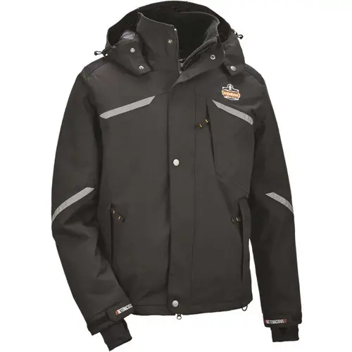 Ergodyne 6466 4XL Black Thermal Jacket 500D Nylon Shell Rugged, Warm & Water-Repellant 500d Nylon Shell Is Highly Durable, Warm And Water-Repellent For The Harshest Winter Work Environments COMFORTABLE WARMTH 3M Thinsulate insulation traps heat for warmth in extremely cold conditions INSULATED QUILTED SLEEVES For comfort, mobility and warmth DURABLE 1600D nylon reinforcements in heavy wear areas FUNCTIONAL POCKETS Exterior back document pocket, exterior front cell phone pocket and an interior audio pocket, two exterior lower front pockets HEAVY-DUTY ZIPPERS Tough YKK zippers with storm flap to seal out wind and rain ADJUSTABLE Removable hood with adjustable drawcords, waist drawstrings and spandex cuffs for custom fit that keeps wind and cold out 3M REFLECTIVE ACCENTS For enhanced low-light visibility MACHINE WASHABLE Mfg #41118