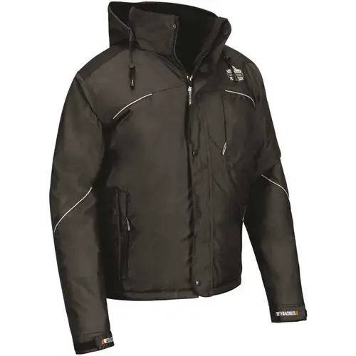Ergodyne 6467 S Black Winter Work Jacket 300D Polyester Shell Durable - 300d Polyester Oxford With Breathable Water-Repellent Coating For Dry Comfort And Long-Lasting Wear COMFORTABLE WARMTH - Thermal insulation and quilted sleeves for warmth in cold conditions ADJUSTABLE FIT - Hook & loop cuffs, drawstring hood, drawstring waist and a long tail make for a custom fit that keeps cold out EASY ON & OFF - Heavy-duty front zipper closure REMOVABLE HOOD - Easily snaps on or off depending on weather conditions or personal preference POCKETS - 1 exterior chest, 1 interior, 2 lower front REFLECTIVE ACCENTS - For enhanced low-light visibility MACHINE WASHABLE Mfg #41122