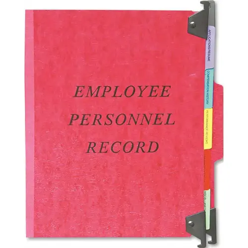 Classification folder with tab in middle position for employees name. Five Mylar reinforced tab dividers within folder: Application/Resume, Compensation History, Performance Reviews, Training/Education, Miscellaneous/History. Reinforced Tyvek tape gusset for expansion to accommodate a growing file. 20 pt. PressGuard covers specially coated to resist moisture. File Folder Type: Expanding; Personnel; Top Tab; Size: Letter; Folder Material: 20 pt. PressGuard; Color(s): Red.