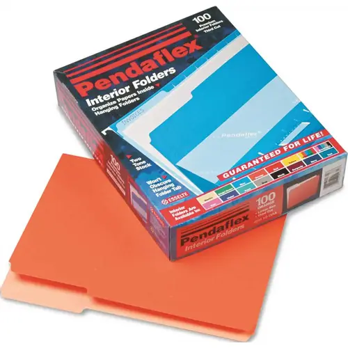 Hard-working interior file folders fit inside hanging folders without obscuring tabs. Perfect for subdividing records within a hanging folder. Two-tone design helps prevent misfiles and is reversible to double your color options. 11 pt. stock. File Folder Type: Interior; Top Tab; Size: Letter; Folder Material: 11 pt. Stock; Color(s): Orange.