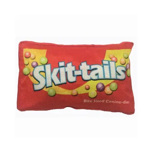 Fun Candy 7" Skit-Tails dog toy. Durable fabric with digital printing design. Crinkle paper inside gives it the "crunch" effect dogs love. Jumbo size squeaker.