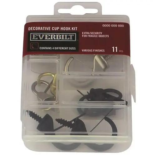 This kit is perfect for securing your favorite household items. Featuring both standard brass cup hooks and safety cup hooks in both oil-rubbed bronze and satin nickel, you can easily secure those fragile items. Kit contains 4 unique sizes.
