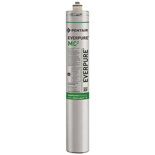 The EVERPURE MC(2) filter cartridge delivers premium-quality water for fountain and combination applications. It improves the taste of fountain beverages and helps retain the drink's carbonation. The quick-change cartridge has a 9,000 Gal. capacity, 1.67 GPM flow rate, and is NSF Certified under NSF/ANSI Standards 42 and 53.