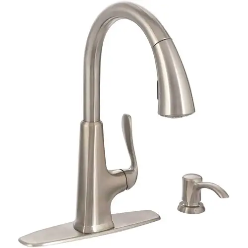 A truly versatile design, the Pfister Pasadena Single-Handle Pull-Down Sprayer Kitchen Faucet is a transitional piece that complements a variety of decor. With beauty and function, you can use the 2-function pull-down spray head for extended reach and maneuverability. Advanced AccuDock technology keeps the spray head securely in place. This stainless steel Pasadena is also easy to clean with rubber nozzles on the spray face that enable quick removal of hard water buildup with just the simple wipe of your finger. These features make Pasadena ideal for today's busy kitchens.