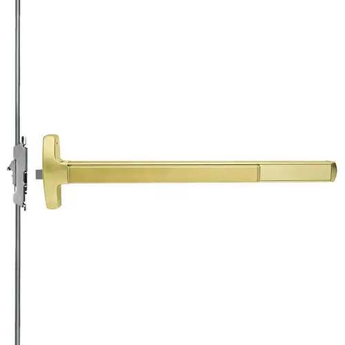 Grade 1 Concealed Vertical Rod Exit Bar, Narrow Stile Pushpad, Fire-Rated Device, 3' Door Width, 84" Door Height, Passage Function, Dane Lever with Escutcheon, Electric Latch Retraction, Satin Brass Finish, Right Hand Reverse