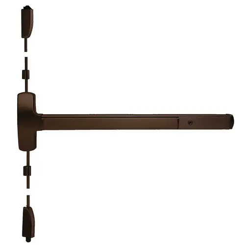 Grade 1 Surface Vertical Rod Exit Bar, Wide Stile Pushpad, 36" Device, 84" Door Height, Dummy Function, Tubular Pull, Motorized Latch Retraction, Request to Exit Switch, Hex Key Dogging, Dark Bronze Anodized Aluminum Finish, Right Hand Reverse, Field Reversible