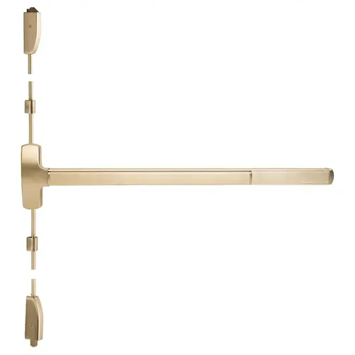 Grade 1 Surface Vertical Rod Exit Bar, Wide Stile Pushpad, 48" Fire-Rated Device, 84" Door Height, Passage Function, Quantum Lever with Escutcheon, Motorized Latch Retraction, Request to Exit Switch, Less Dogging, Satin Brass Finish, Right Hand Reverse, Field Reversible