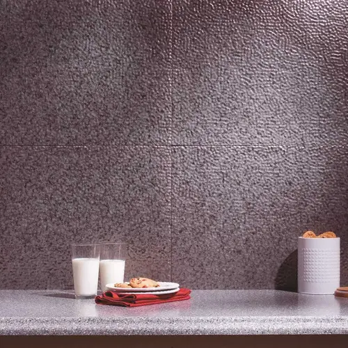 Transform an ordinary kitchen or bathroom into a stylish space. Decorative thermoplastic backsplash panels for use in kitchens and bathrooms provide the classic look of traditional tin backsplash at a fraction of the cost. Whether remodeling an entire room or simply accenting a small area, these backsplash panels create an instant designer look. Unlike traditional tin panels that require decades to acquire an antique look, these backsplash panels have that turn-of-the-century authenticity right out of the box. Finishes range from matte white or brushed aluminum to Bermuda bronze or cracked copper. Adding an artistic element to your kitchen or bathroom has never been easier. The backsplash panels can be cut with a snip, scissors or utility knife for quick and easy installation. Installs with 2-sided tape or polyurethane construction adhesive.