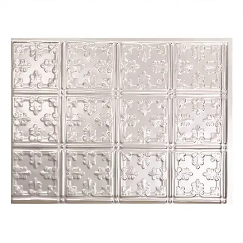 Transform an ordinary kitchen or bathroom into a stylish space. Decorative thermoplastic backsplash panels for use in kitchens and bathrooms provide the classic look of traditional tin backsplash at a fraction of the cost. Whether remodeling an entire room or simply accenting a small area, these backsplash panels create an instant designer look. Unlike traditional tin panels that require decades to acquire an antique look, these backsplash panels have that turn-of-the-century authenticity right out of the box. Finishes range from matte white or brushed aluminum to Bermuda bronze or cracked copper. Adding an artistic element to your kitchen or bathroom has never been easier. The backsplash panels can be cut with a snip, scissors or utility knife for quick and easy installation. Installs with 2-sided tape or polyurethane construction adhesive.