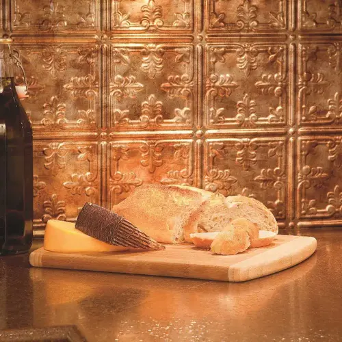 Transform an ordinary kitchen or bathroom into a stylish space. Decorative thermoplastic backsplash panels for use in kitchens and bathrooms provide the classic look of traditional tin backsplash at a fraction of the cost. Whether remodeling an entire room or simply accenting a small area, these backsplash panels create an instant designer look. Unlike traditional tin panels that require decades to acquire an antique look, these backsplash panels have that turn-of-the-century authenticity right out of the box. Finishes range from matte white or brushed aluminum to Bermuda bronze or cracked copper. Adding an artistic element to your kitchen or bathroom has never been easier. The backsplash panels can be cut with a snip, scissors or utility knife for quick and easy installation. Installs with 2-sided tape or polyurethane construction adhesive.