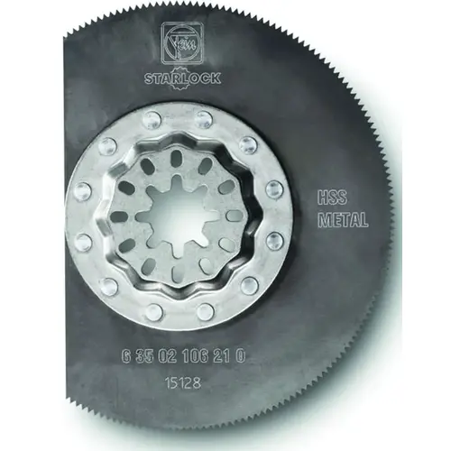 Solid HSS saw blade with metal toothing for sheet metal up to approximately 1/16 in. Also for plastics, wood, glazing, compound, brass and bronze. Clean, narrow cutting line. Ideal cutting speed. Segmented, for working in corners and on edges without over cut. 3-3/8 in Dia blade.