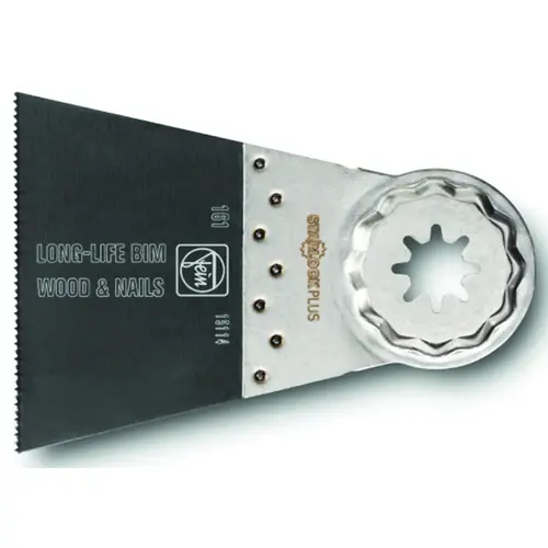 Bi-metal with teeth set for all woods, plasterboard and plastic materials. Very clean cut and excellent work progress. Extremely robust, unaffected by nails in wood (up to approximately 3/16 in Dia), masonry. 2-9/16 in W x 2 in L. Wide shape for maximum cutting performance and long straight cuts.