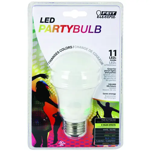 Make any celebration a lot more festive with the Feit Electric A19/LED/PARTY/CAN Color Changing LED. It produces 6 different effects (White, Red, Green, Blue, Flashing and Smooth Transitions) and uses 0.6 W of electricity. This bulb has both automatic and manual settings, transitioning smoothly through each color cycles. Feit Electric Color Changing LED bulbs are instant on to full brightness, have an average life of 100,000 hr/91.3 years and are RoHS compliant. Choose a dependable party light for any porch, room or party.