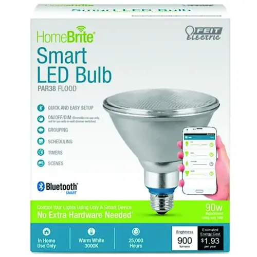 Turn on or off any light in the house easily with HomeBrite smart PAR38/LED/HBR LED light bulbs. Designed with Bluetooth Smart technology, HomeBrite smart LED light bulbs can be easily controlled by any tablet or smart device without the need for a Wi-Fi or cellular signal. It's simple to set up, install HomeBrite light bulbs throughout the house and download the HomeBrite app. The 3000K warm white light is On/Off/Dim and will replace 90 W equivalent incandescent bulbs. It produces a similar light output (900 Lumens), uses 16 W of electricity and up to 82% less energy than a standard incandescent light bulb. Get instant on to full brightness with relatively cool running performance. Feit Electric PAR38 bulbs have an average life of 25,000 hrs/22.8 years. No extra hardware needed.