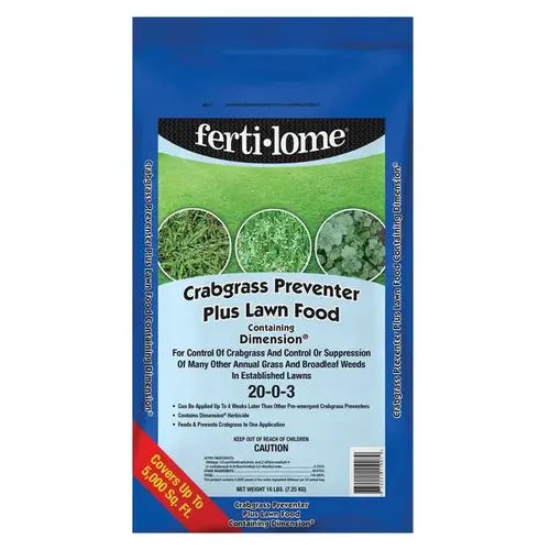 Crabgrass Preventer Plus Lawn Food containing Dimension 20-0-3 controls Crabgrass and controls or supresses many other annual grass and broadleaf weeds in established lawns. Always read and follow label directions.