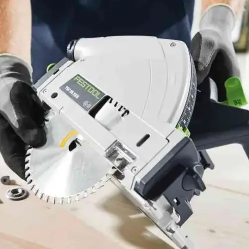 Often, even just a millisecond is crucial: The kickback is the most common cause of serious injuries when using a track saw. Festool's unique kickback stop, therefore, stops the saw blade of our cordless track saw in the blink of an eye, not only protecting your workpiece but also helping to minimize the risk of injury to your hands. In addition, this now allows users to make powerful, precise cuts at up to twice the speed with an extended battery range. Combined with the new generation of saw blades, it allows for maximum cutting performance and perfect cutting quality. The sawing system is rounded off with clever accessories such as guide rails, an angle stop, a splinter guard, and a saw table.