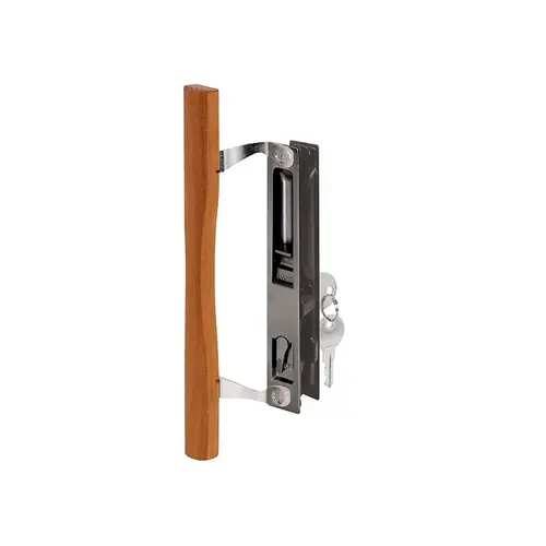 This sliding patio door handle set is constructed of mixed materials including wood and diecast components, and it features a keyed exterior pull. The outside locking pull and the inside supports are constructed of diecast and come finished in a black painted color and chrome finish respectively. The inside pull is made of natural wood and is finished in a smooth, clear finish. This handle set is a flush mounted, hook style handle set and it is non-handed allowing it to be used on both left and right-handed patio sliding doors. This handle set fits all popular flush lock punch-outs with a 6-5/8 in. hole center spacing, and it is used to replace damaged or missing flush mounted, hook style handle sets on sliding glass doors ranging from 1 in. to 1-1/8 in. thick door frames. This item is packaged complete with a keyed cylinder lock, 2 keys and 4 different hook lengths. Installation instructions and all fasteners necessary for the installation of this handle set are included in packaging, including the 2-11/16 in. keeper that mounts on the jamb. Product selection tip: besides matching the style and type of locking mechanism, the other main specification to match is the measurement of the mounting hole centers, from center-2-center.