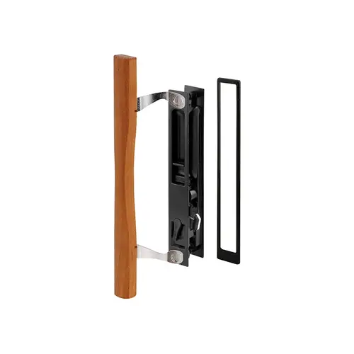 This non-handed diecast black flush mount patio door handle with wood pull is a design that fits Croft series 301 patio doors, and a variety of other manufacturers of 7/8 in. to 1-1/8 in. thick patio doors. It comes with a shim to accommodate the thinner 7/8 in. thick door. Mounting holes are 6-5/8 in. on center. The inside and outside handles are 7/8 in. wide and 7-1/4 in. tall. It comes with a keeper and has a 4 latch hook assortment to accommodate the needs of most doors.