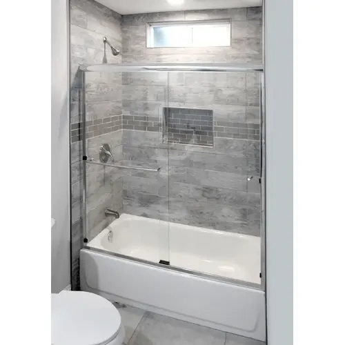 Our CDK Classic Series Frameless Sliding Shower Door Kits offer a cost-effective engineered design, that maintains a brilliant, low-profile frameless look, using 1/4" (6mm) tempered glazing. The top hangers clamp to the glass and do not require glass fabrication. Precision bearings and wheels offer a quiet glide experience. One standard size fits most applications. Available Stock Size: 60" W x 72" H (1.52 x 1.83 m). CDK kits are offered with a slim line header, and vertical metal jambs and sill for, inline applications. Kits with fixed panels are not available.