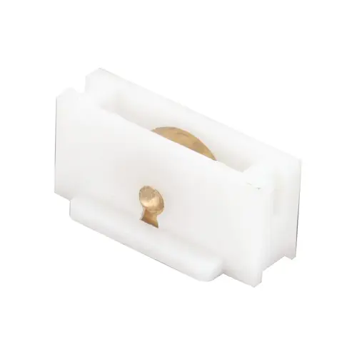 This is a white plastic roller assembly. The roller is made of brass flat edge and most often used by Elco, Better- Bilt Aluminum and a variety of other manufacturers.