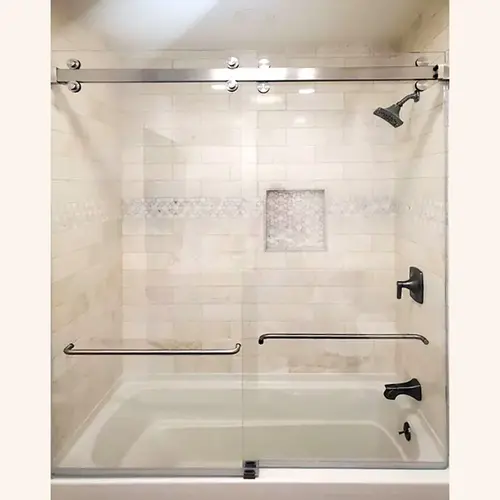 Our popular Napa Series Frameless Bypassing Sliding Shower Door Kit offers a modern, low profile design, that includes a rectangular header and round glass rollers. It's engineered for use with 3/8" (10mm) tempered glazing. Each top glass roller requires one 3/4" (19mm) diameter hole in the glass for proper mounting. Precision bearings and wheels also offer a quiet glide experience. One standard size fits most 180 degree inline applications. Our in stock 73" wide kits can be cut to size.