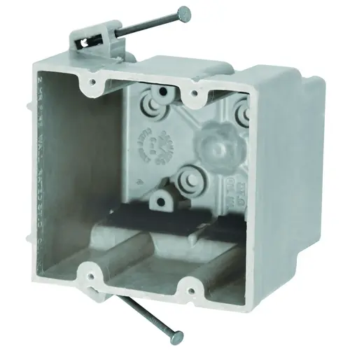 Thermoset fiberglass with angled mid-nails, speed clamps. Lightweight, non-corrosive, non-conductive, no ground required. Will not melt or distort in high heat. Shatter-resistant in cold temperatures. 2 hrs wall fire rating. 3 in x 4 in x 3-3/4 in. UL listed.