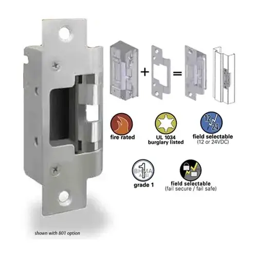No Cutting on Frame Required for 4-7/8" Ansi Prep; Vertical Adjustability to Accommodate Door Sag and Misalignment; Tamper Resistant; Field Selectable Fail Safe/Fail Secure; Non-Handed; Plug-in Connector