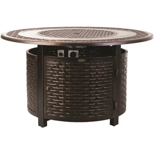 We are proud to offer our multi-functional Bellante Woven Cast Aluminum LPG Fire Pit. This 50,000 BTU unit operates on a standard 20 lbs. propane tank which safely sits underneath the unit, and is accessible through a hinged door. Our Bellante Woven Cast Aluminum LPG Fire Pit not only functions as a fire pit, but an outdoor patio table with its convenient cast aluminum fire bowl lid. This unit produces a beautiful full flame. Plus, it comes complete with clear fire glass (18 lbs.), and covers for the fire pit and propane tank.