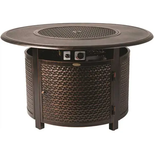 The Weyland Round Gas Fire Pit boasts a hammered antique bronze finish that will be right at home in your outdoor space. With a practical aluminum build and an output of 50,000 BTU, this versatile fire pit pulls double duty in warmer weather as a patio table when covered with the included fire bowl lid. Arriving with clear fire glass for a stylish touch, just add a standard 20 lbs. propane tank behind the handy hinged door. A vinyl weather cover for the fire pit is included for your convenience.