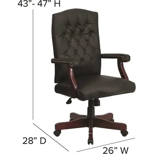 Give your office a refined look with a traditional tufted office chair that never goes out of style. This classic executive office chair makes a statement all on its own to let clients know that you are about your business when they enter your office. This luxurious traditional desk chair is upholstered in sumptuous LeatherSoft material that blends leather and polyurethane for added softness and durability. Handsomely styled, this swivel office chair with all its buttoned glory has an arched top and a 5.5" thick cushioned seat for comfort. The scroll arms with brass nail accents offer a stylish place to rest your arms. Functions include a tilt lock mechanism, a knob underneath the seat to control the tilt function, and an adjustable swivel seat height with pneumatic lever. Although classically styled, this button tufted swivel chair updates your office to give you a complete look that you'll love. Round out your home office space or business office with our mahogany computer desk for a rich arrangement.