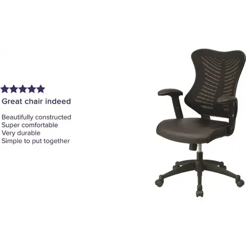 If you've never owned a mesh back chair, then you're in for a real treat with this black mesh back ergonomic task chair with LeatherSoft seat. The ventilated design allows air to circulate to your back, keeping you cool and comfortable enabling you to concentrate on the task at hand and increasing your productivity. This chair has important features such as an innovative curved back with lumbar support, pneumatic seat height adjustment and the ability to recline/rock back and forth with the tilt lock mechanism that make your purchase worthwhile. Padded and adjustable arms offer proper relief to your shoulders and neck while the waterfall seat reduces pressure on your legs for maximum comfort. Aesthetically pleasing ribbed details and white contrasting stitching on the seat and arms make this computer chair a welcome addition to your workspace whether you work in the office or from home. Upgrade your seating with this designer executive office chair and make your work day much more enjoyable.