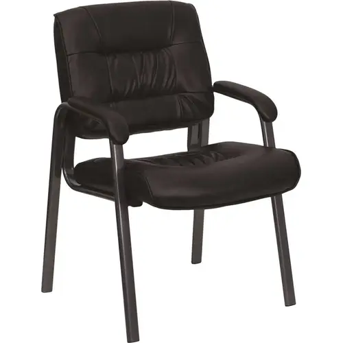 Make a great first impression when your customers or clients visit your place of business with this Black LeatherSoft Executive Side Reception Chair with Titanium Gray Metal Frame. It features a comfortable, contoured tufted seat and back that are padded with 2" of CAL 117 fire retardant foam. LeatherSoft is leather and polyurethane for added Softness and Durability. A waterfall edge seat helps to reduce pressure and promote healthy blood flow to your legs while the padded armrests take the pressure off the neck, shoulders and arms allowing your guests to feel more comfortable. The sturdy metal frame will stand up to heavy use and plastic floor glides protect your floor by sliding smoothly when you need to move it. The sleek modern side chair offers a professional appearance for your reception area, desk or conference table.