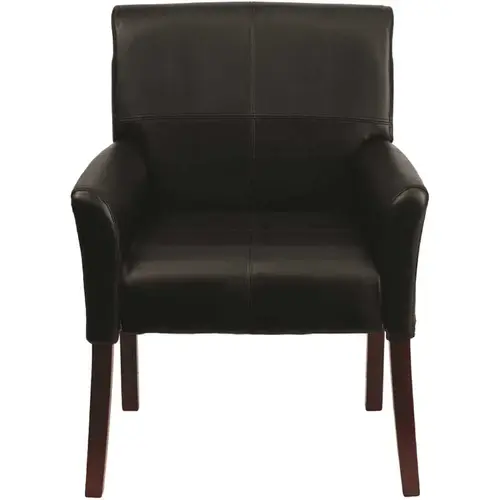 Welcome guests into your business with this gorgeous side reception chair. Place several wooden guest chairs around a round conference table in the office to hold meetings away from the desk. No office, no problem, make a conversational setting off your living room or in that empty room near the entrance, the design pairs well with glass and wooden tables. Fit for any space, this guest chair serves as a comfortable waiting room chair, lobby chair or office chair. Box stitch upholstery on the back and seat add a refined appearance. High wooden legs finished in a mahogany stain appeal to contemporary and traditional settings. Add sophistication to your office or home with a pair of black Leather Soft guest chairs. This classically styled side chair will never go out of style, making it a great option for planning for the future of your business.
