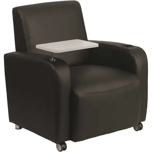 Welcome your visitors and colleagues with this black LeatherSoft guest chair with tablet arm. The chair has a plush seat with foam padding and features a tablet arm for working on a laptop or completing paperwork. The tablet arm swings a full 360 degrees to position it at the ideal angle. A built-in cup holder keeps hands free for writing or typing while minimizing the possibility for spills. Easily move this chair by lifting up the back and rolling it on the two front wheel swivel casters. Sturdy, rear chrome legs are capped with plastic floor glides to protect your floor by sliding smoothly when you move it. Whether you're creating a dedicated study space for a college or library or a productive space for visitors to wait, this attractive chair is an excellent choice.