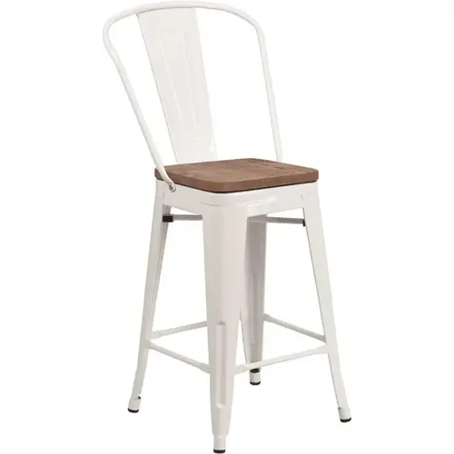 Give yourself a leg up on other seating with this Bistro style counter height stool. This cafe chair will give your dining room, kitchen counter or eatery a refreshing rustic feel with its metal and wood features. This stylish metal stool features a curved back with a vertical slat and a cross brace under the seat for added support and stability. A wood seat adds comfort and beauty. The lower support brace doubles as a footrest, and the glides protect your floor by sliding smoothly when moving it. Designed for both commercial and residential use, this trend-setting colorful counter height stool is a great choice for your restaurant's dining or bar area or use this contemporary dining chair at home in your kitchen, dining room or home bar.