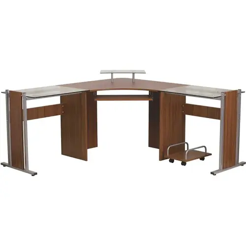 This breathtaking workstation is a multi-functional desk to help you keep your projects organized and on track. It's stylish, featuring a beautiful teakwood laminate finish, two side desks with glass work surfaces and an attractive silver powder coated frame. With a glass monitor shelf and teakwood sliding keyboard tray to keep the desktop clear for paperwork and writing materials this piece takes functionality to new heights. A mobile CPU cart holds your hard drive and gives you the flexibility to roll it out of the way, when needed. Floor glides protect your floor's surface by sliding smoothly when you need to move it. Whether you're just starting a business or have been on the job for years investing in this hardworking desk will work in your favor.