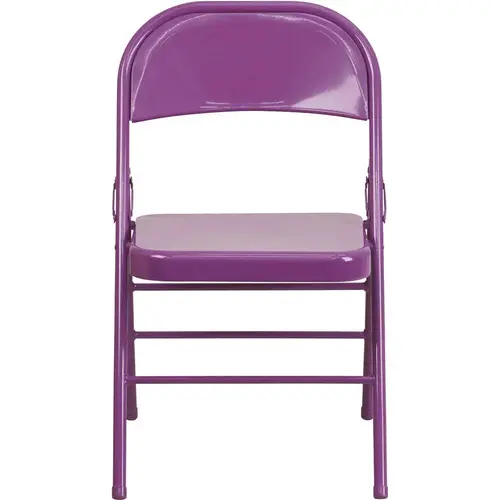 This metal folding chair is a colorful option for everyday use or when you need extra seating in a residential or commercial location. It features a premium 18-Gauge, curved steel frame. Though lightweight and easy to fold, transport and store, this chair is sturdy enough to hold up to 300 lbs. The legs are triple braced, with an integrated foot rest and double-hinged with riveted steel components. Non-marring floor glides on the legs protect your floors by sliding smoothly when you need to move the chair. Suitable for indoor-outdoor use, these brightly colored chairs are an affordably stylish way to brighten up your home, school or workplace.