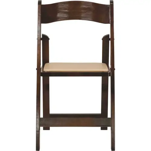 Create a memorable event with this stunning Fruitwood Folding Chair with Vinyl Padded Seat. The chair is constructed of Beechwood that is finished in a clear lacquer varnish. The vinyl padded seat is detachable for easy replacement in heavy use venues. With an easy to clean surface, simply dust off or wipe off the surfaces. This chair has a compact design for easy set up and take down and folds for transport or storage. This wood folding chair is the premier solution for banquet halls, weddings, graduations, and other upscale events. The functional design will add a sophisticated look to your home dining room, or kitchen and allows you to accommodate additional guests for a party, indoors or outdoors.
