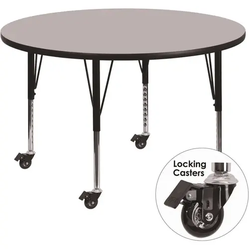 This Round Activity Table is a must have for daycare, preschool and early childhood development centers. Enhance collaborative learning by grouping tables together. It will accommodate children up to age-7. It features a 42 in. thermal fused scratch, stain and warp resistant laminate top with a black edge band and 16-Gauge tubular steel legs for increased stability. The top incorporates a protective underside backing sheet to prevent moisture absorption and warping. An attractive black powder coated finish protects the upper legs from scratches and height adjustable chrome lower legs give you the flexibility to raise or lower the table a full 9 in. in 1 in. increments. Casters allow you to easily move the table around and then lock into place. Perfect for craft time, snack time and party time, this easy to clean table is just the right size for small children.