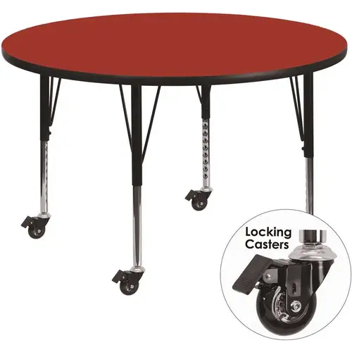 This Round Activity Table is a must have for daycare, preschool and early childhood development centers. Enhance collaborative learning by grouping tables together. It will accommodate children up to age 7. It features a 48 in. thermal fused scratch, stain and warp resistant laminate top with a black edge band and 16-Gauge tubular steel legs for increased stability. The top incorporates a protective underside backing sheet to prevent moisture absorption and warping. An attractive black powder coated finish protects the upper legs from scratches and height adjustable chrome lower legs give you the flexibility to raise or lower the table a full 9 in. in 1 in. increments. Casters allow you to easily move the table around and then lock into place. Perfect for craft time, snack time and party time, this easy to clean table is just the right size for small children.