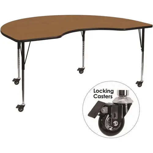 The Kidney Activity Table is a versatile option for school classrooms, corporate training centers and your home. Enhance collaborative learning by grouping tables together. It will accommodate children of all ages, from 1st grade to adult. It features a 48 in. W x 72 in. L thermal fused scratch, stain and warp resistant laminate top with a black edge band and 16-Gauge tubular steel legs for increased stability. The top incorporates a protective underside backing sheet to prevent moisture absorption and warping. An attractive black powder coated finish protects the upper legs from scratches and height adjustable chrome lower legs give you the flexibility to raise or lower the table a full 9 in. in 1 in. increments. Casters allow you to easily move the table around and then lock into place. This activity table provides a durable work surface for anything from computer labs to project meetings to laying out fabric in your sewing room.