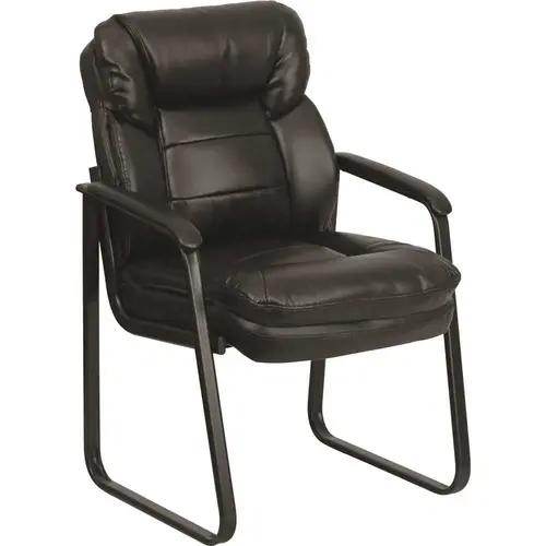 Ideal for any upscale or casual office setting, this LeatherSoft upholstered executive side chair with sled base serves as a stylish, yet comfortable solution for your facility's seating needs. LeatherSoft is leather and polyurethane for softness and durability. This reception chair is the perfect way to greet your patients or clients in your waiting room or reception area. The seat's contoured cushion and pair of curved arms also combine to offer unparalleled comfort. In addition to being able to complement any existing decor, the black metal frame is designed for maximum durability. Plus, a sled base with non-marring floor glides make the chair a great option for carpeted floors, as unlike traditional swivel or straight-legged options, its sled base won't snag and pull the floor's threads or fabrics.