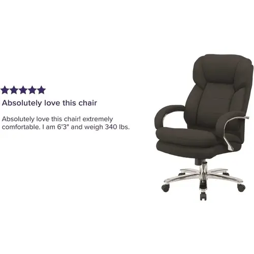 This Big & Tall Executive Office Chair is an ideal chair for larger and taller professionals who spend long hours sitting behind a desk. An extended upper back with integrated headrest and built-in lumbar support reinforces healthy posture. The 22" wide swivel seat is double padded with 4" of foam. Raise or lower the seat using the pneumatic height adjustment lever for a custom fit. Generously padded loop arms reduce pressure on the shoulders and neck providing additional comfort. Turn the tilt tension adjustment knob to increase or decrease the amount of force needed to rock or recline and lock the seat in place with the tilt lock mechanism. This sturdy chair has a heavy duty chrome base, smooth rolling dual wheel casters and a 500 pound weight capacity. Whether you're buying chairs for a 911 dispatch office, call center, or control room, this 24/7 intensive use office chair is the right chair for the job.