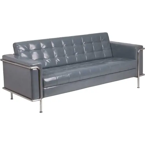 Your office reception space speaks to who your are as a company and this gray LeatherSoft upholstered sofa with encasing frame makes quite a statement. This trendsetting piece features a straight arm design, and foam filled, tufted, fixed back and seat cushions for exceptional comfort. LeatherSoft is leather and polyurethane for added softness and durability. The integrated stainless steel frame and exposed accent bar not only add style, they are rust resistant and will keep up with the rigors of commercial use. Make a great impression on your clients, customers, and guests with this innovative contemporary sofa. This progressive style seating brings comfort and trend-setting style to your waiting room, reception area or home.