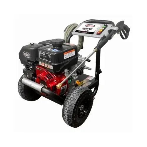 Simpson????MegaShot Series 3400PSI Pressure Washer. Simple to use and great for cleaning decks, patios, outdoor furniture, house siding and prepping home exteriors for painting. 3400PSI at 2.5GPM with a Kohler SH265. OEM Technologies axial cam cold water pump. Welded, steel frame construction with a powder-coated finish. MoreFlex 5/16" x 25. ft higher pressure hose. Includes 5 quick connect nozzle tips. 2 year limited consumer engine warranty, 1 year limited consumer pump warranty, 5 year limited consumer frame warranty and 90 day limited accessory warranty.