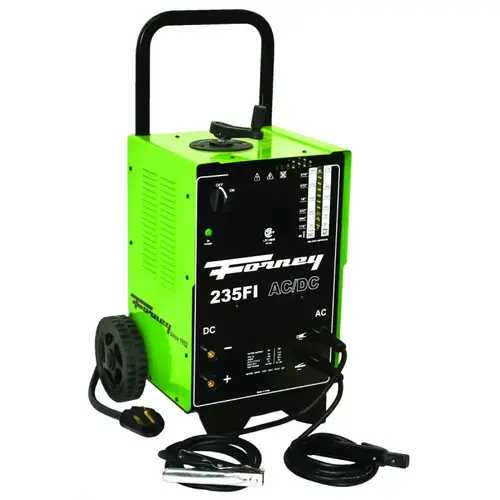 This welder has a duty cycle of 20% at 230 A, 50% at 150 A AC, 20% at 180 A and 35% at 135 A DC. The electroholder cable is 3 m 25 sq-mm, the earth clamp cable is 2 m 25 sq-mm, both with dense connector. Input cable American wire gauge (AWG) 10, 2.5 mm. 50 A plug. CSA certified Cat #00329, wheel and handle kit for "Forney" 00313 and 00314 must be purchased separately. Weighs 116 lb (52.62 kg).